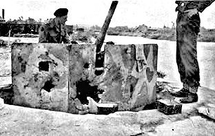 The defences on NAN GREEN were anchored on the West end by a powerful 88 mm antitank gun in a massive type R669 concrete bunker. The walls and roof of this imposing structure were constructed of reinforced concrete 7 to 9 feet thick. The gun was positioned to fire East along the beach and could wreak havoc among B Squadron’s tanks and the Regina Rifles as they landed. As we will see later it was singled out for special attention during the landings. In addition to this emplacement, NAN GREEN was covered by a 50 mm antitank gun in an open concrete emplacement mounted beside the river Suelles about 100 metres to the rear of the 88mm bunker. This gun was able to fire both East or West and could cover both Hussar beaches. A second Type R669 bunker with a French 75mm field gun was located on the East end of the beach positioned to fire West. This bunker was very well disguised as a house. Situated just South and East of this position was a large Type R663 concrete machine gun bunker covering the Eastern and rearward approaches. Scattered between these guns along the sea wall were 8 “Tobruk bunkers” (concrete machine gun emplacements) and 2 mortars.