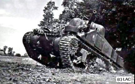 The group under Captain Harrison advancing on the left entered a large orchard defended by a reinforced company of infantry and several antitank guns. Here the action can best be described as barely controlled chaos. Trooper Dodds notes that they were firing HE at trenches left and right. Sometimes the enemy trenches were so close that they had to back up in order to depress the gun enough to engage. They quickly ran out of HE in the turret and began to engage bunkers with Armour Piercing (AP) rounds. The Co Driver Tempe was handing Dodds ammunition from the racks beside him and Dodds was grabbing rounds from the rack behind the driver one handed on his own. He was one handed because the coax machine gun had fired so much that the cover over the breach would not stay closed and he had to hold it down while Sergeant Johnstone fired. At one point Dodds was firing the coax himself as Germans that the gunner did not see ran in front of them. Soon the coax became so hot that it began to “Cook off” that is fire on its own until Dodds stopped it by releasing the body cover that he was holding down. As the gunner Johnstone was engaging targets on his own, Captain Harrison was engaging the German infantry swarming around the tank with hand grenades. Dodds remembers handing him 12 high explosive and 11 smoke grenades. During a brief lull Captain Harrison attempted to regain some control of the Squadron by requesting nearby tanks to move one at a time so that he could identify who was who. While doing this he was wounded in the head. Sergeant Johnstone moved up to bandage the captain ordering the driver Huckell to continue to advance. At the same time word came over the radio that German tanks were approaching. Dodds was on the floor replenishing the turret ammunition racks when there was a tremendous bang and vibration. The driver’s hatch was blown off and the main gun was knocked out. The advancing German tanks very quickly knocked out Harrison’s and five other tanks. Sergeant Johnstone yelled “Bail out” and both he and the captain were gone. Given the amount enemy small arms fire hitting the tank Dodds decided the escape hatch in the floor would be a safer exit. The escape hatch, sealed shut by water proofing material since D-Day was stuck fast and Tempe had to use a hammer from the gunner’s kit to get it open. With the hatch off they could see that the tank was moving slowly in reverse and as Huckell turned to take it out of gear two more hits sent sparks up through the hatch. Dodds' immediate response was to launch himself out through the the turret and hit the ground running for the nearest cover.